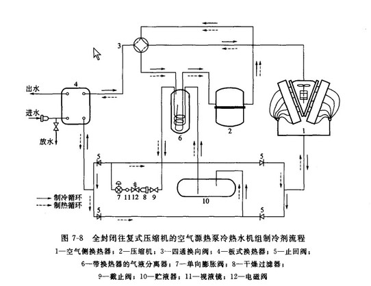 如圖7-8 所示,以全封閉往復(fù)式壓縮機的空氣源熱泵冷熱水機組為例。在空氣源熱泵機組制冷運行時.壓縮機吸入氣液分離器中低壓制冷劑氣體,經(jīng)壓縮增壓后排出高壓氣體,經(jīng)過四通換向閥至空氣側(cè)換熱器,在空氣側(cè)換熱器中經(jīng)風(fēng)機使空氣循環(huán)帶走熱量,冷卻為高壓液體.經(jīng)大分液頭匯集后,通過單向閥組中的一個單向閥流入貯液器,此時若有未冷凝的氣體則充于貯液器頂部。液體又通過貯液器底部,經(jīng)干燥過濾器后去除水分和雜質(zhì),再經(jīng)視液鏡至膨脹閥,高壓液體經(jīng)膨脹閥節(jié)流后減壓膨脹變?yōu)榈蛪旱闹评鋭┮后w,經(jīng)過單向閥組中一個單向閥和小分液頭后均勻進入水側(cè)板式換熱器中,制冷液體在換熱器套管內(nèi)吸熱汽化,而套管外的水被冷卻,達到使用要求。 ![]() 低壓氣體從換熱器中出來,經(jīng)四通換向閥后到氣液分離器中,經(jīng)氣液分離器至壓縮機氣口.保證回壓縮機的流體全部為氣體.至此.完成一個制冷循環(huán)。 在空氣源熱泵機組制熱運行時,壓縮機吸入氣液分離器中低壓制冷劑氣體,經(jīng)壓縮增壓后排出高壓氣體,經(jīng)過四通換向閥至水側(cè)板式換熱器,在水側(cè)板式換熱器中高壓氣體放熱冷卻為高壓液體,而套管外的水被加熱,達到使用要求。 高壓液體經(jīng)小分液頭匯集后,通過單向閥組中一個單向閥流人貯液器.此時若有未冷凝的氣體則充于貯液器頂部。液體從貯液器底部經(jīng)干燥過濾器后去除水分和雜質(zhì),再經(jīng)視液鏡后至膨脹閥,高壓液體經(jīng)膨脹閥后減壓膨為低壓的制冷劑液體,經(jīng)過單向閥組中一個單向閥和大分液頭后均勻地進入空氣側(cè)換熱器,制冷劑液體在換熱器銅管內(nèi)吸熱汽化,而銅管外由風(fēng)機使空氣循環(huán),提供熱源,低壓氣體在空氣側(cè)換熱器中汽化后經(jīng)四通閥到氣液分離器中,經(jīng)企業(yè)分離器至壓縮機吸氣口,保證回壓縮機的流體全部為氣體,至此,完成一個制熱循環(huán)。 應(yīng)用螺桿壓縮機或其他類型壓縮機的空氣源熱泵機組的工作原理和制冷劑流程與上述過程基本一致。 |