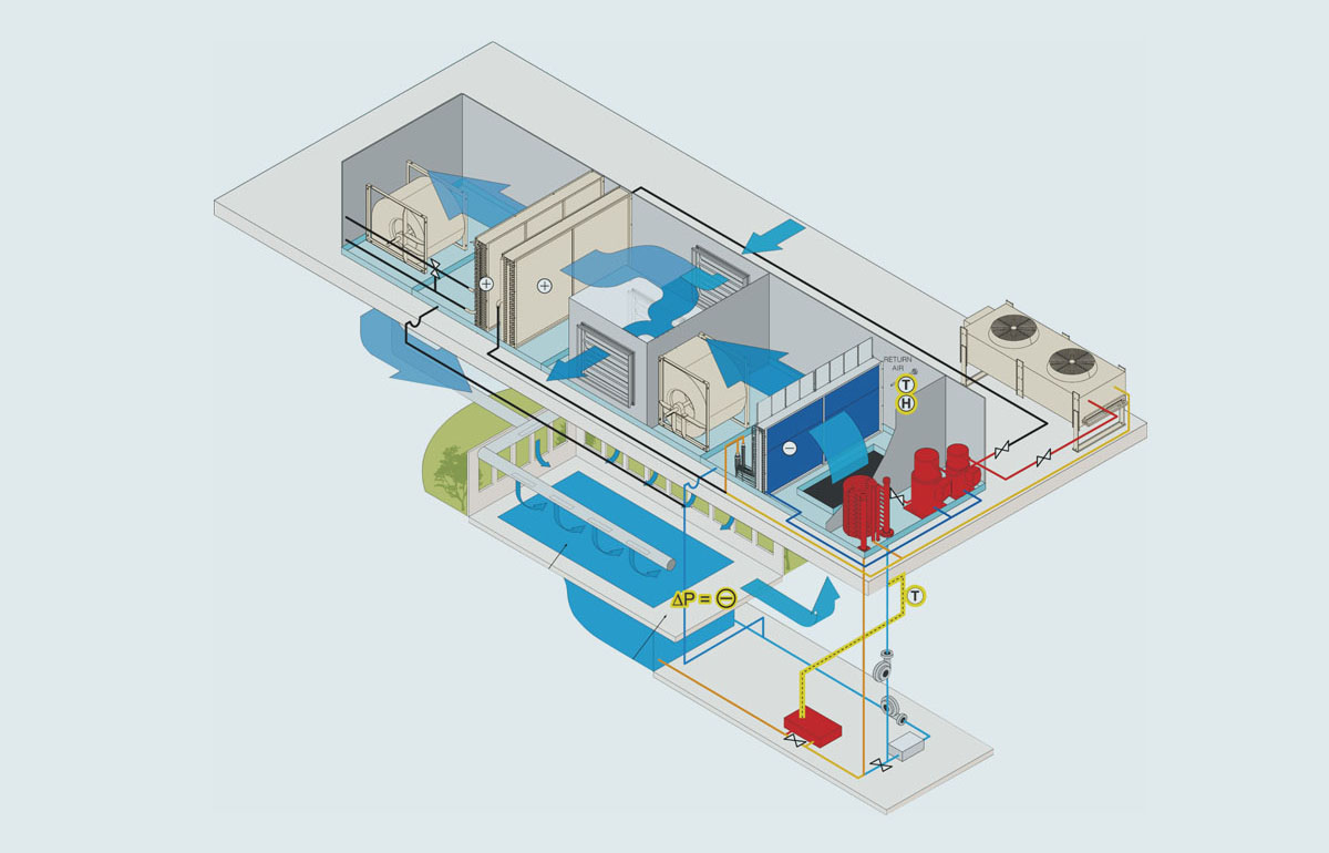 是室內(nèi)游泳池環(huán)境控制系統(tǒng)的代表。同時(shí)采用送風(fēng)機(jī)、回風(fēng)機(jī)和全調(diào)式風(fēng)閥控制風(fēng)機(jī)。這種完全可調(diào)的特點(diǎn)可以充分利用加熱、制冷和除濕節(jié)能技術(shù),減少制冷程序的運(yùn)行。