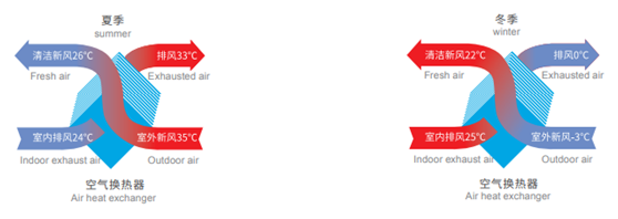 運(yùn)用熱回收技術(shù)進(jìn)行室外的新風(fēng)與室內(nèi)的排風(fēng),在全熱回收器中進(jìn)行能量交換, 夏季運(yùn)行模式下,新風(fēng)回收了排風(fēng)帶走的冷量, 冬季運(yùn)行模式下,新風(fēng)回收了排風(fēng)帶走的熱量,讓屋里溫濕平衡,冬不冷夏不熱,提高房子舒適感,再也不用擔(dān)心買房子朝向不好了!